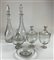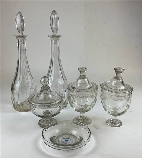 Manifattura del secolo XIX. Lotto composto da coppia di bottiglie con tappo, coppia di coppe con coperchio e una coppa con coperchio e piatto in cristallo molato e inciso (h max cm 43,5) (difetti)