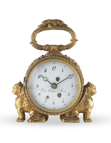 Orologio in foggia di marescialla, seconda metà del secolo XIX. Movimento solo tempo con sveglia. Cassa in bronzo dorato sorretta da leoni alati, manico a serpi. Quadrante in smalto a numeri arabi, firmato Ch. Oudin a Paris. Lancette del tipo breguet (difetti e sostituzioni)