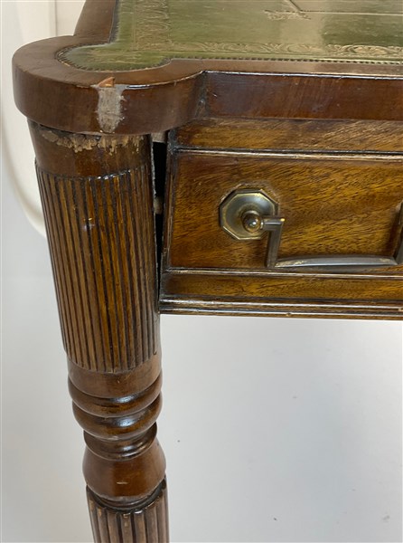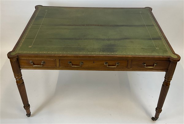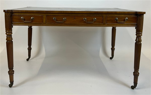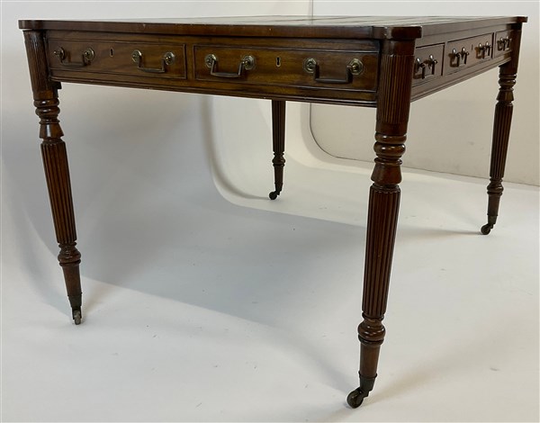 Scrittoio da centro in mogano a tre cassetti nella fascia su ambo i lati, gambe in parte scanalate su rotelle, piano in pelle impressa in oro. Inghilterra, secolo XIX (cm 128x77x98) (difetti)