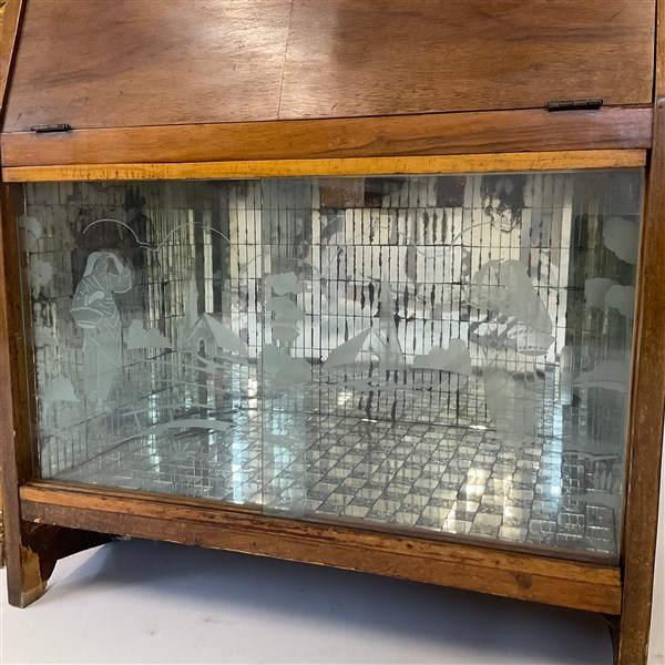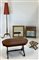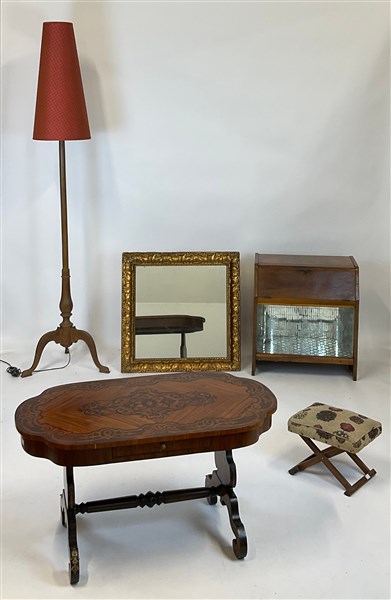 Lotto composto da un tavolo da salotto in legni vari, un mobile bar con vetrina, una lampada a stelo con base tripode, uno sgabello e uno specchio con cornice in legno dorato (h tot lampada cm 215) (difetti)