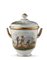 Manifattura del secolo XIX. Cremiera biansata con coperchio in porcellana decorata in policromia a veduta marina con pescatori e paesaggi, bordure in oro (h. cm 13) (difetti)