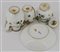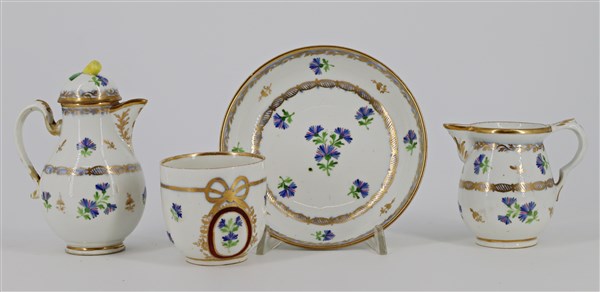 Manifattura di Vienna, secolo XIX. Servizio da caffè solitaire in porcellana decorata in policromia e dorature a fiocchi e fiorellini. Composto da caffettiera, lattiera e tazzina con piattino (h. max cm 12; piattino d. cm 13,5) (difetti e restauri)