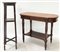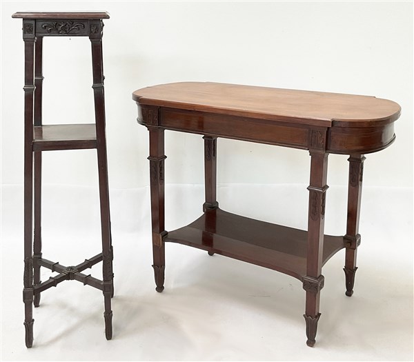 Lotto composto da un'alzata portavaso a due ripiani in legno con decori intagliati (cm 30x108x30), ed un tavolino con piano superiore ovale, gambe rastrenate in legno intagliato (cm 98x78x47) (difetti e mancanze)