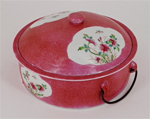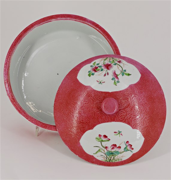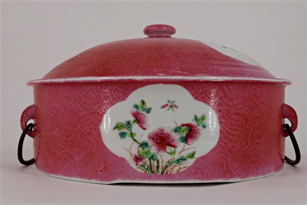 Contenitore circolare biansato con coperchio in porcellana con decoro a fiori su fondo rosa