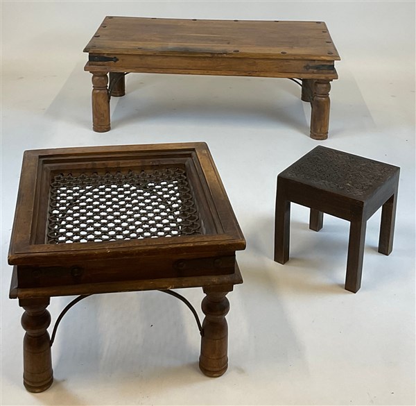 Arte etnica. Lotto composto da tre diversi tavoli da salotto in legni vari e fe