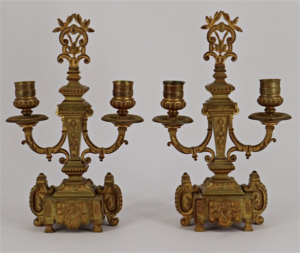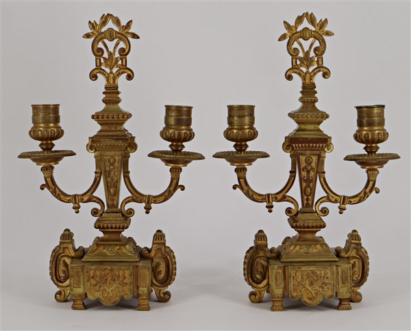 Coppia di candelabri a due fiamme in bronzo dorato decorati a volute e foglie (
