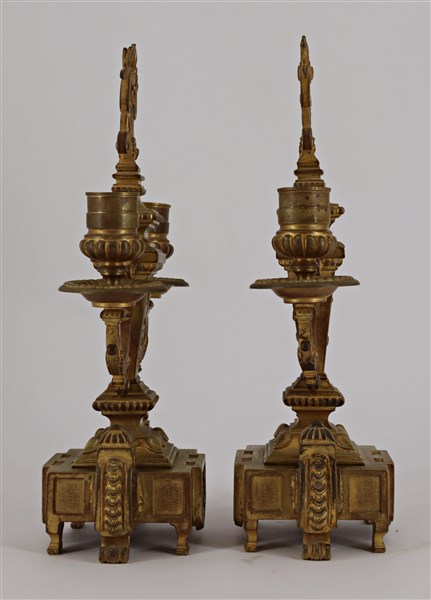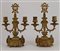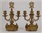 Coppia di candelabri a due fiamme in bronzo dorato decorati a volute e foglie (h. cm 28) (difetti)
