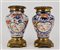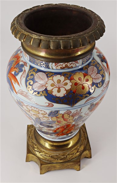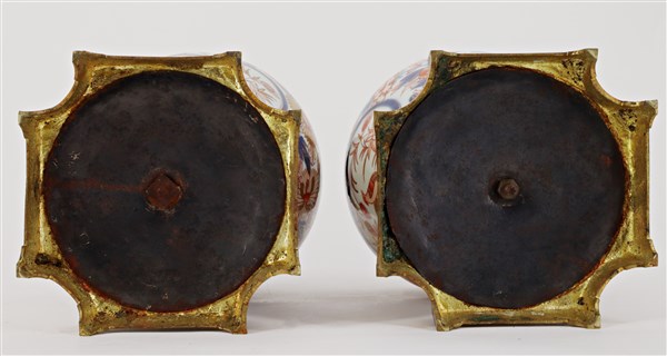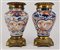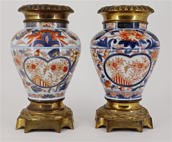 Coppia di vasi con base e ghiera in bronzo, corpo in porcellana a decoro Imari
