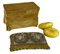 Cartone contenente cuscini di varie fogge e misure unito ad un pacchetto in legno intagliato e rivestito in velluto (difetti)