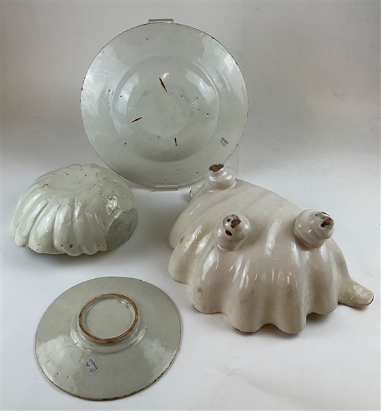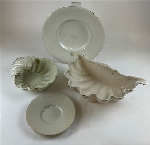 Manifatture differenti, secolo XVIII-XIX. Lotto composto da due diversi bacili a valva di conchiglia e due diversi piatti in maiolica bianca (d max cm 36) (difetti e restauri)