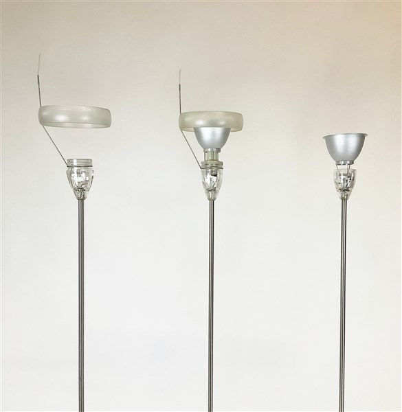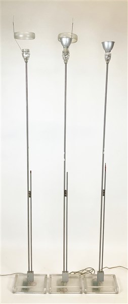 Lot 1566 | Tre lampade a stelo in metallo con base in vetro, diffusori in vetro e plastica