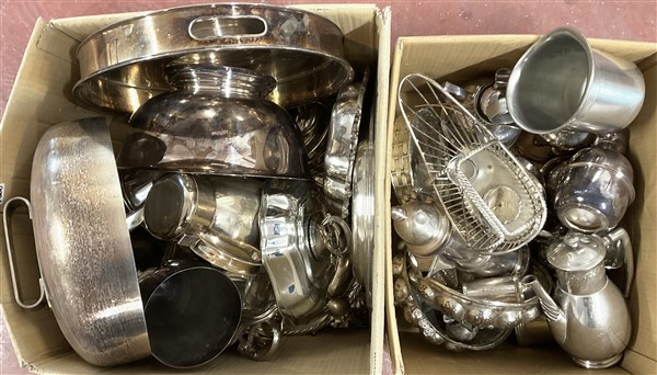 Due cartoni contenenti oggetti in metallo argentato di diverso uso e manifattur