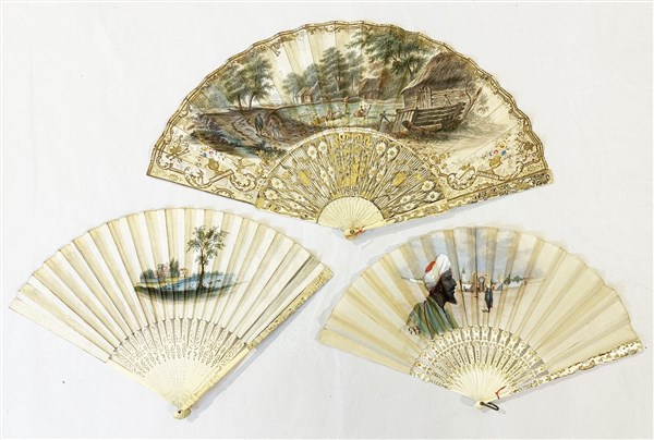Arte del secolo XIX. Lotto di tre ventagli con stecche in avorio inciso, traforato, argentato e dorato con pagine dipinte a figure e paesaggi. Uno con figura di moro siglata in basso a sinistra (difetti)