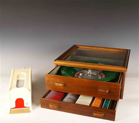 Lotto composto da una scatola contenente una roulette con relative fiches, un sabot per carte da gioco e una piccola scacchiera da viaggio.