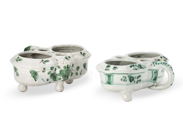 Manufacture Cerreto Sannita, 18th century. Lot comprising of two ampoule holders (L. max cm 21) (minor defects)