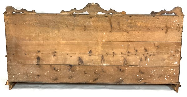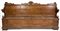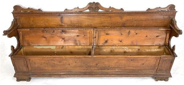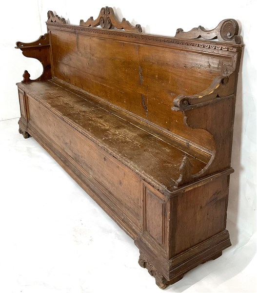Antica panca in legno intagliato, cimasa traforata con decoro a volute (cm 248x