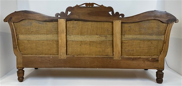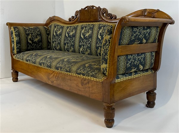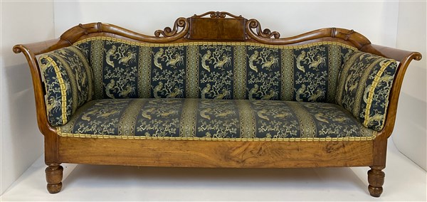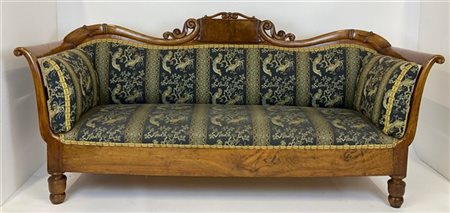 Divano a ventaglio con schienale sormontato da cimasa intagliata e traforata, a volute contrapposte centrato da riserva radicata rettangolare, gambe tornite. Secolo XIX (L. cm 225) (difetti)