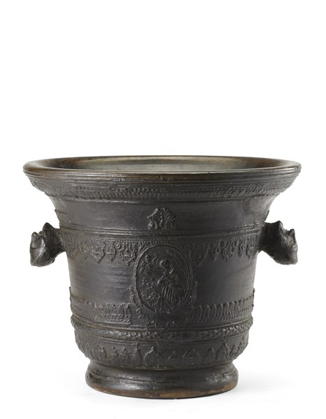 Manifattura Francesco Pelloli, manu Petri Ruffinis 1779. Mortaio in bronzo con anse a teste antropomorfe. Corpo a campana rovesciata con fasce a rilievo e iscrizione datata centrata da figura allegorica (h cm 27) (difetti)