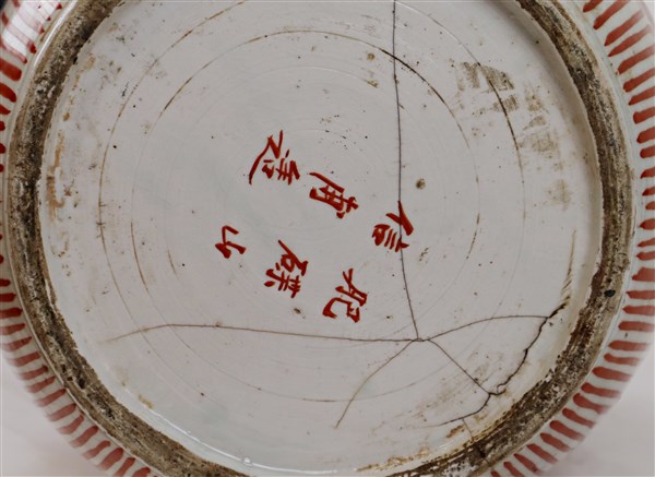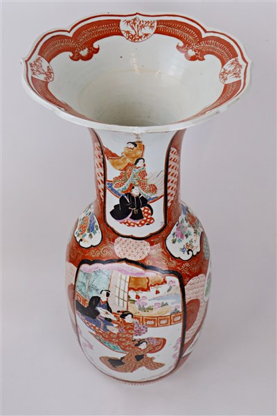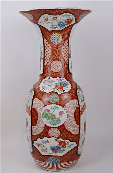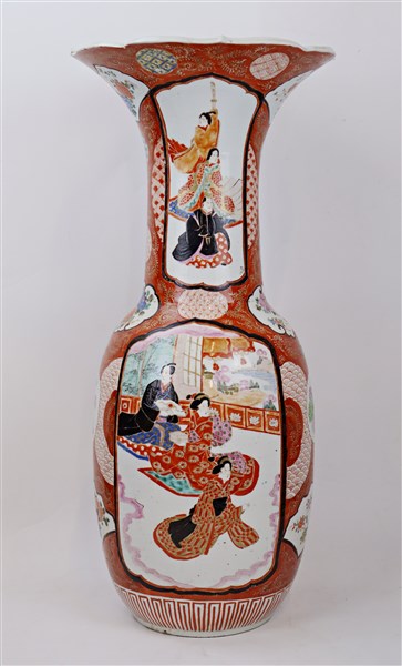 Vaso in porcellana policroma Arita, con collo a tromba, decorato con figure femminili entro riserve sagomate e fiori, il fondo decorato con medaglioni e motivi geometrici