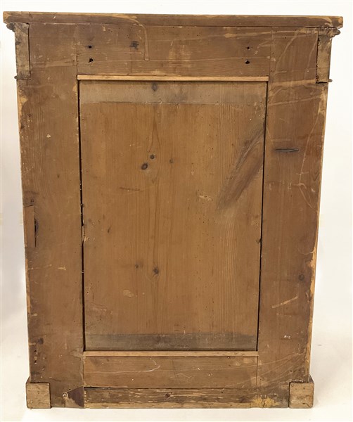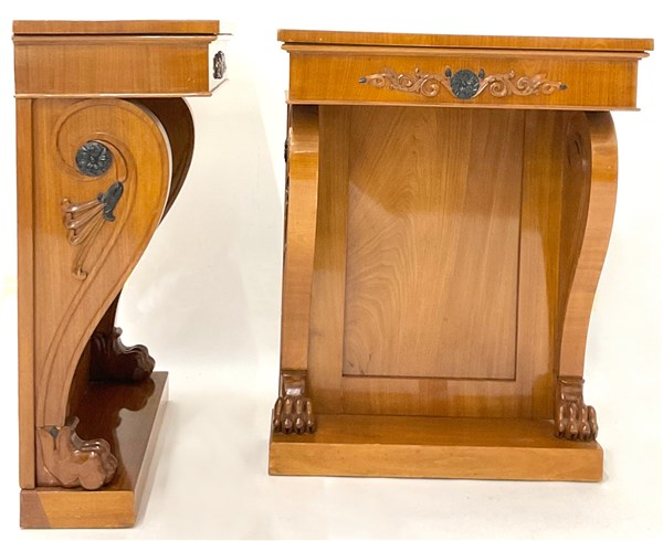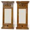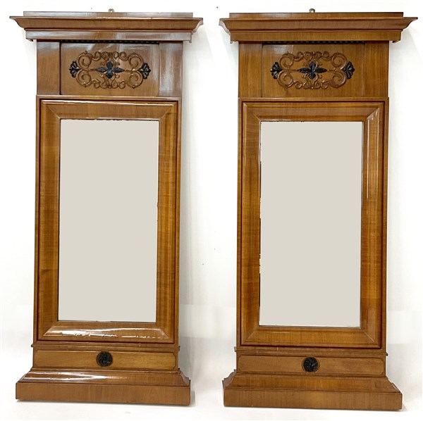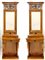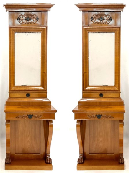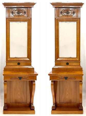 Coppia di console con specchiera impiallacciate in piuma con decori a rilievo ed in parte ebanizzati, montanti con piedi ferini. Nord Europa, dine secolo XIX (cm 66x218x32) (lievi difetti)