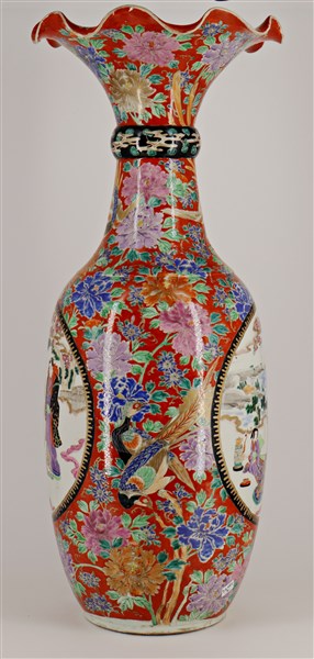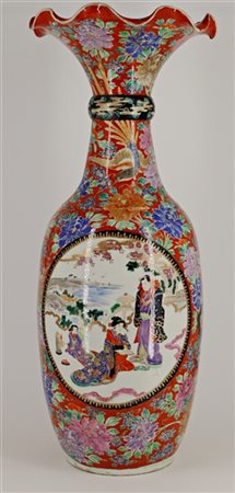 Vaso in porcellana policroma con collo a tromba polilobato riccamente decorato a motivi floreali e riserve con scene di vita all'aperto