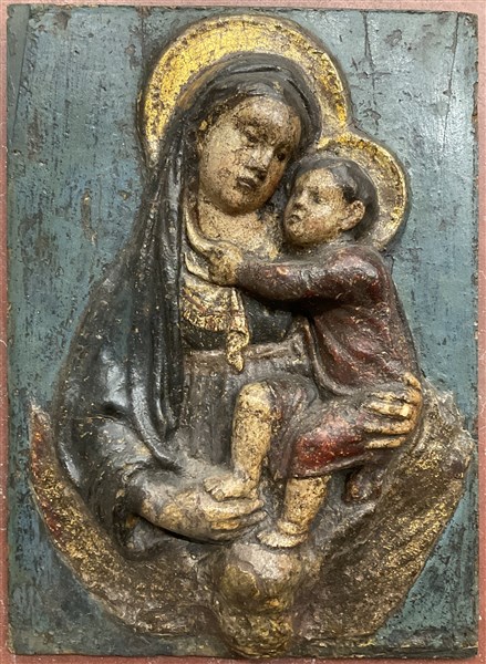 Arte del secolo XVI "Madonna col Bambino" rilievo in cartapesta dipinta e dorat