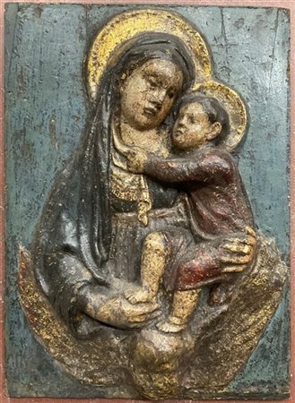 Ignoto "Madonna col Bambino" Antico rilievo in cartapesta dipinta e dorata. Supporto ligneo di epoca posteriore (cm 37,5x27) (difetti e restauri)