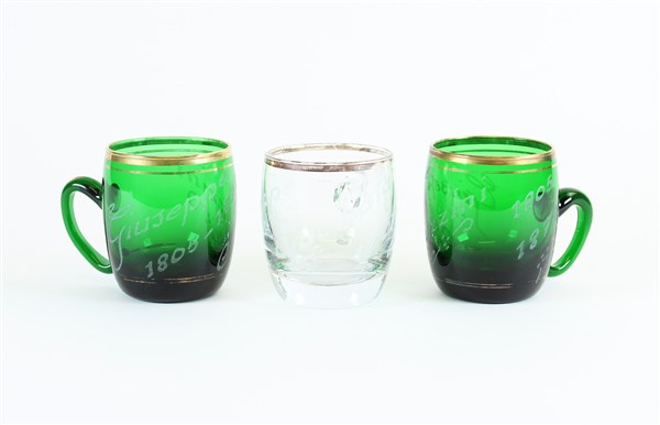 Coppia di tazze commemorative in vetro verde Iscritte Giuseppe Mazzini 1805-1872 unite ad una in vetro incolore con le date di nascita e morte di Giuseppe Garibaldi (difetti)