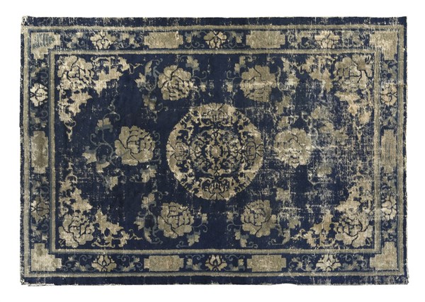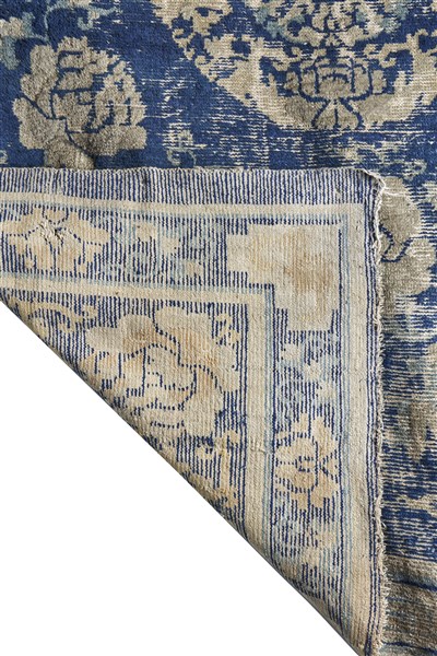 Tappeto Ning-Xia. Decoro con medaglione tondeggiante su campo blu cosparso di peonie (difetti, rapature e buchi)