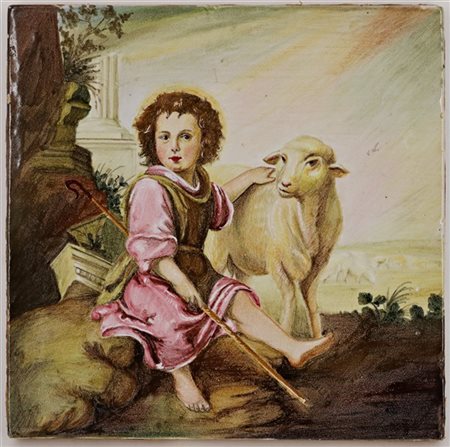 ''Gesù Bambino con agnello'', piastrella in ceramica dipinta in policromia, firmata al verso (cm 20x20) (lievi difetti)