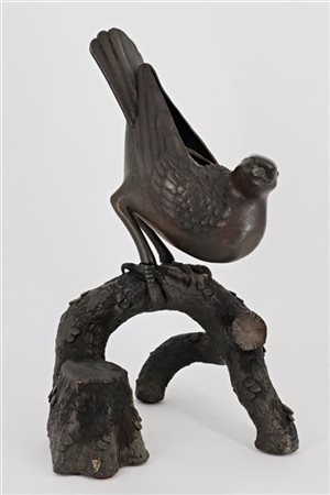 Scultura in bronzo raffigurante un volatile su ramo. Giappone, periodo Meiji (h cm 39,5) (difetti e mancanze)