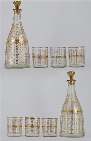 Set in vetro lumeggiato in oro composto da una coppia di bottiglie con tappo e sei bicchieri decorati a motivi fitomorfi (h bottiglie cm 31) (difetti)