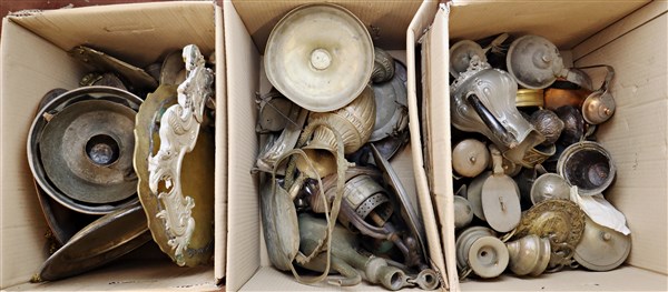 Lotto di trecartoni contenenti numerosi oggetti di differente forma, in bronzo ed altri metalli (difetti e mancanze)