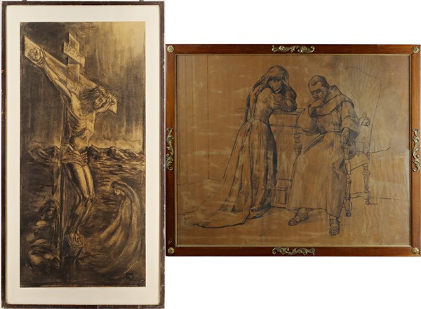 Lotto composto da due disegni a soggetto religioso, carboncino su carta. Di div
