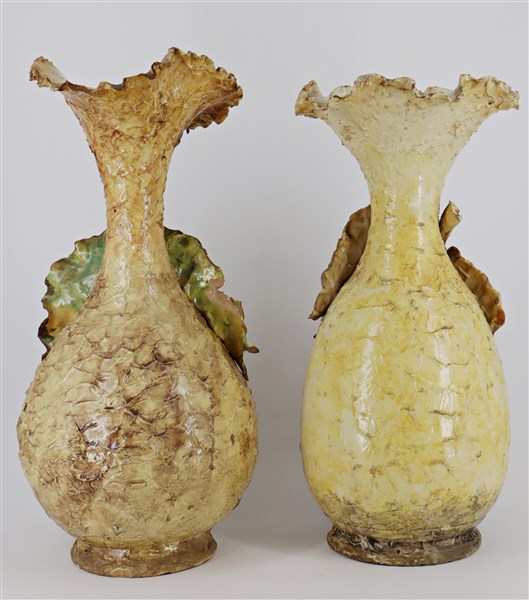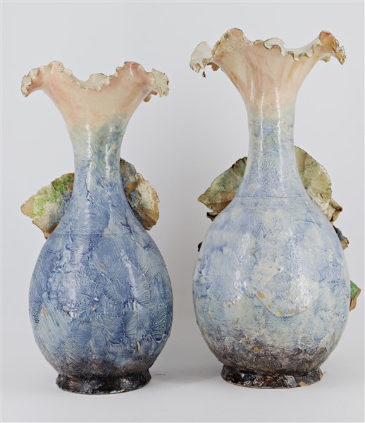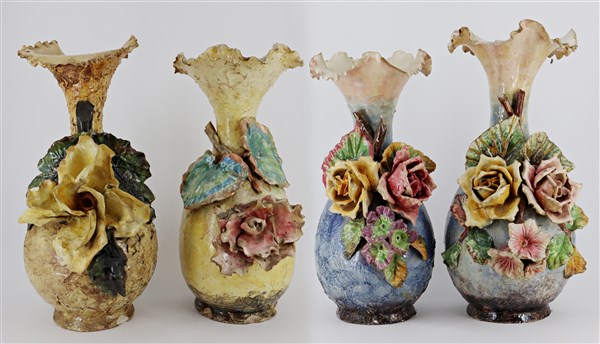 Lotto composto da quattro diversi vasi in ceramica dipinta in policromia con decorazioni floreali appicate a rilievo (difetti, mancanze e restauri)