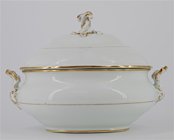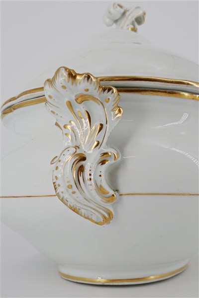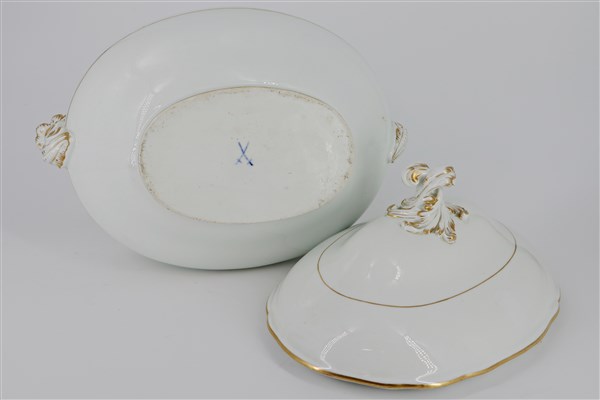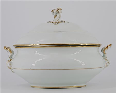 Manifattura di Meissen, secolo XIX. Zuppiera biansata in porcellana bianca con presa a rocaille e profili in oro (l cm 35) (lievi difetti)