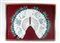 Coppia di ventagli con stecche in osso traforato e pagina formata da piume di pavone in parte dipinte in policromia con figure orientali e fiori (cm 48x29 cad.) in unica teca (cm 54x74) (lievi difetti)