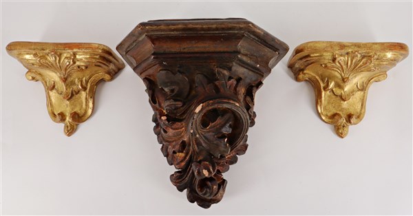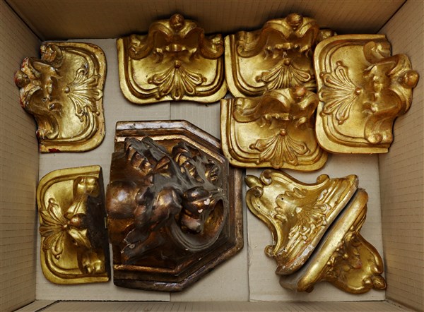 Cartone contenente numerose mensoline in legno intagliato e dorato e una mensol