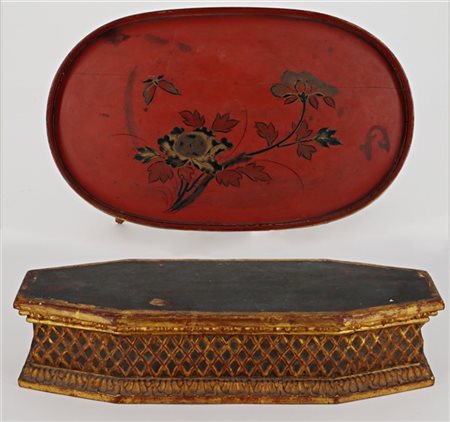 Lotto composto da un'alzatina in lacca a decoro floreale con base dorata (l cm 33), ed una base del secolo XIX in legno laccato e dorato (cm 50x11x17) (difetti e mancanze)