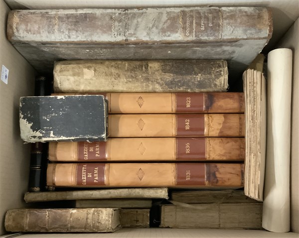 [LIBRI ANTICHI] - Quattro cartoni di libri antichi e moderni, fra cui almanacchi reali, Gazzetta di Parma 1823-1842, La Sicilia illustrata. Milano: Sonzogno, 1892. Non collazionato, difetti da esaminare e non passibile di storno. [4]