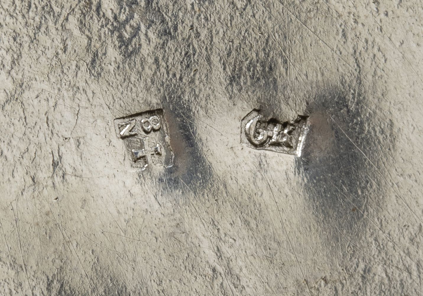 Poggiante su un basamento di forma quadrata sbalzato, cesellato e traforato a motivi floreali.