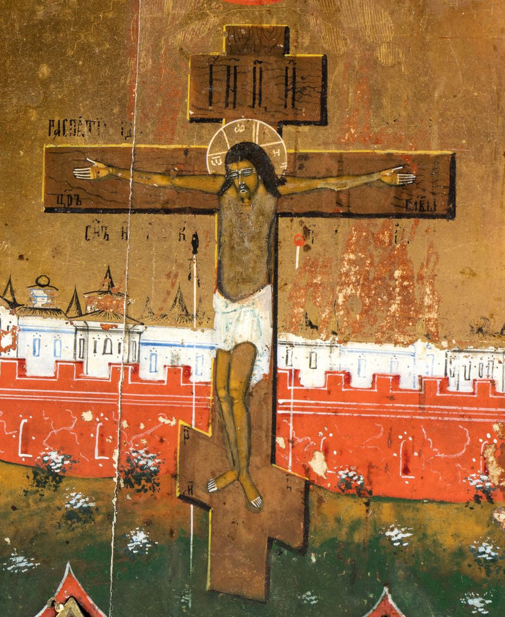 Nel registro inferiore troviamo una grande icona da viaggio realizzata in bronzo con cornice semplice sagomata e smalti policromi, composta di quattro pannelli raffiguranti le Sedici feste ortodosse.