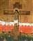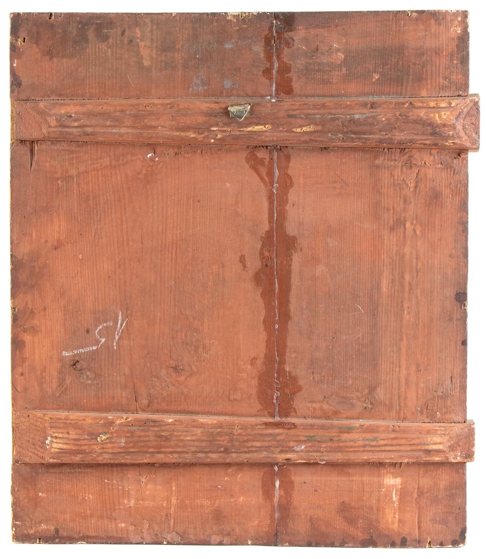 Altezza x larghezza x profondità: 55 x 46 x 3,7 cm. Domina la scena la Crocifissione di Cristo, completata da due medaglioni con la Vergine ed il Bambino da una parte e l’arcangelo con due profeti dall’altro.