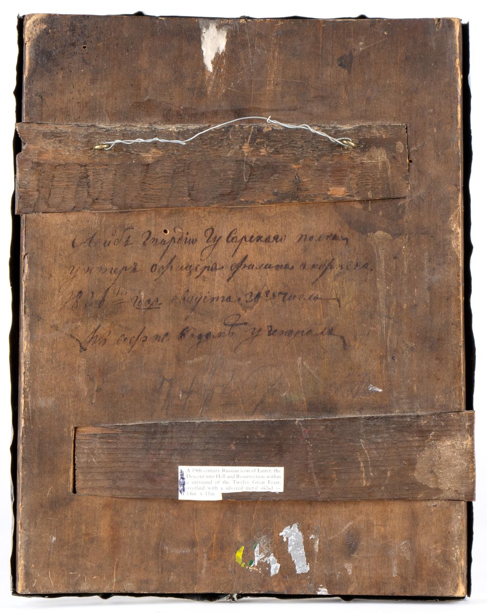 Questa icona raffigura la Pasqua contornata dalla raffigurazione in sequenza di logica teologica delle Dodici Grandi Feste del calendario ortodosso, tratte da episodi dell'Antico e Nuovo Testamento.