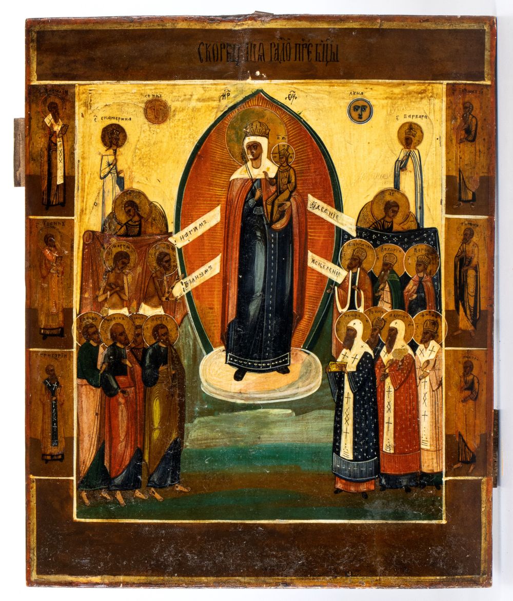 Icona russa raffigurante la Madre di Dio gioia di tutti gli afflitti XIX secolo Altezza x larghezza x profondità: 43 x 35,5 x 3 cm.