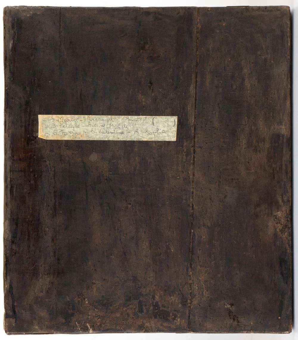 Ripaertita in nove edicole con cornice a decori intrecciati e perlinati, all'imerno delle quali sono raffigurati vari Santi, tra i quali S. Marco, S. Valentina, S. Sofia e l'Arcangelo Michele.