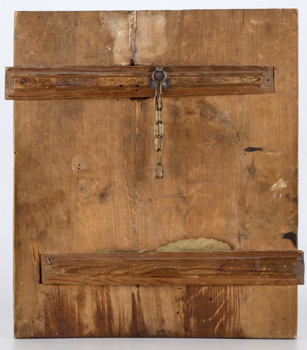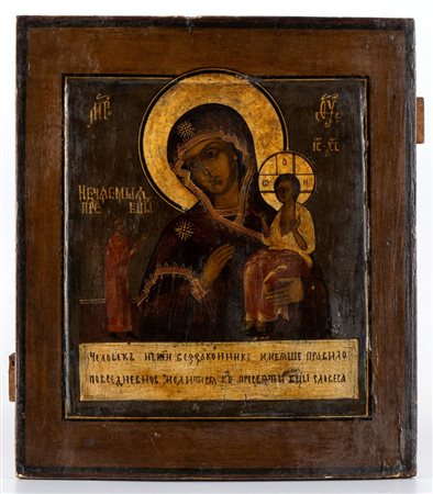 Icona russa raffigurante la Madonna con bambino Fine XIX secolo Altezza x larghezza x profondità: 35 x 30 x 1,7 cm.