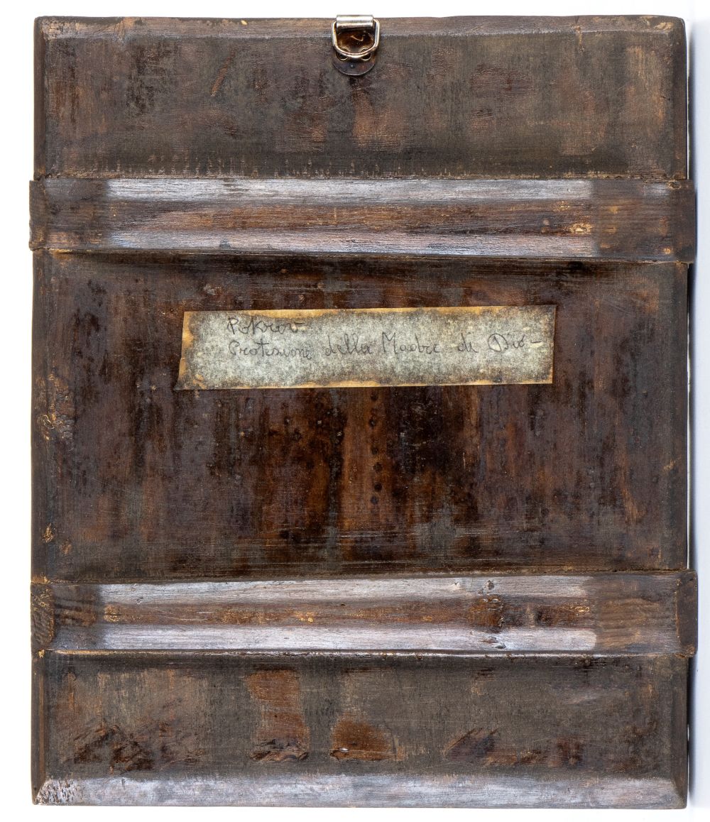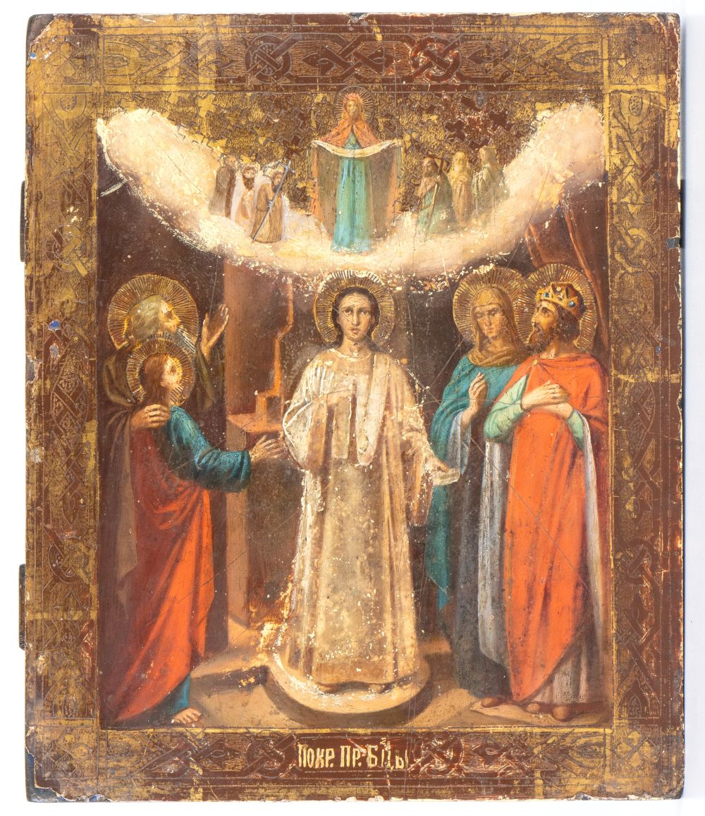 Icona russa raffigurante la Madonna di Pokrov Fine XIX secolo Altezza x larghezza x profondità: 30,8 x 26,6 x 2 cm.