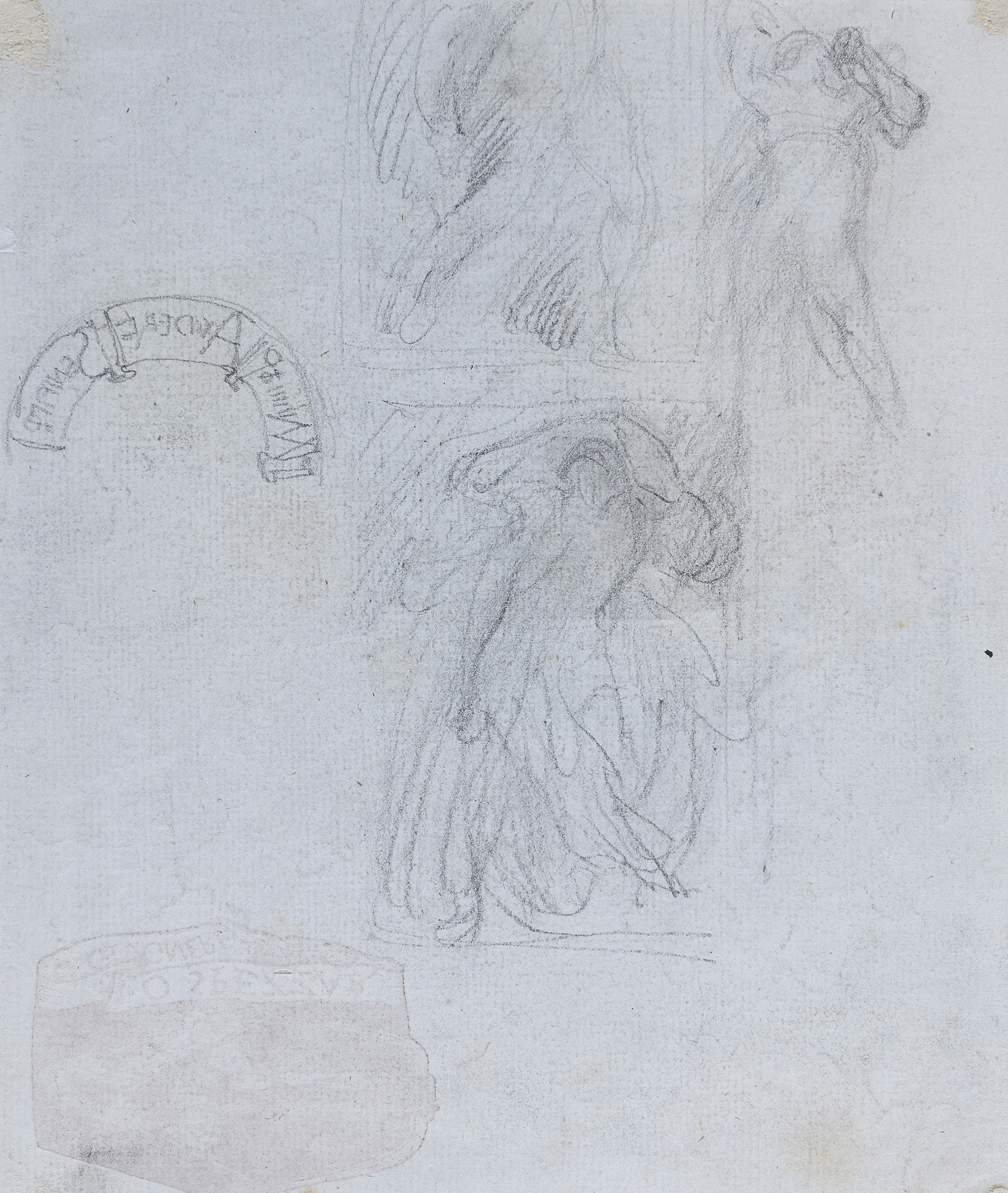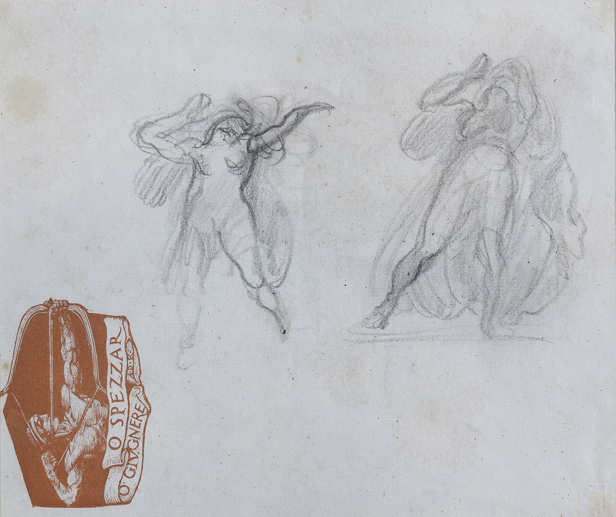 Carboncino su carta con motto D'Annunziano 'O spezzare o giungere' illustrata da Adolfo De Carolis, cm. 19 x 22