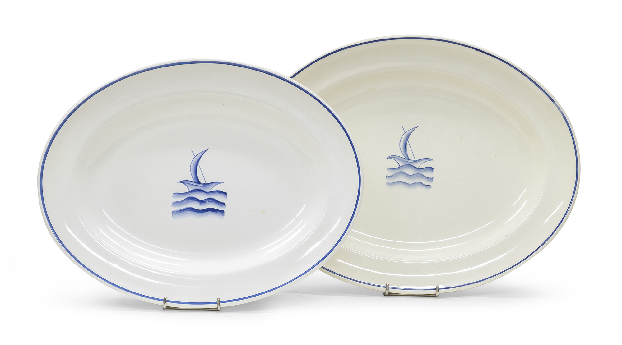 in ceramica a fondo bianco con decoro a barchette in blu.
